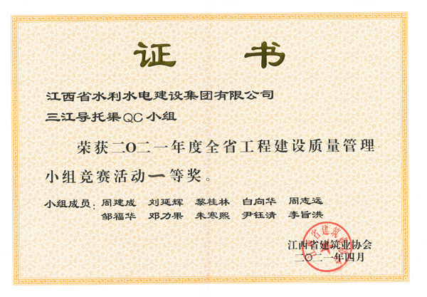 近日,2021年度江西省工程建設質(zhì)量管理小組競賽活動公布名次,由公司三江導托渠QC小組開展的QC活動榮獲小組競賽活動一等獎。該獎項的獲得,為公司工程創(chuàng)優(yōu)奠定了堅實的基礎,為公司爭得了榮譽,今后,江水建設將繼續(xù)深入開展QC活動,秉承工匠精神推動質(zhì)量提升,打造更多精品工程,為樹立集團公司品牌形象繼續(xù)努力。
