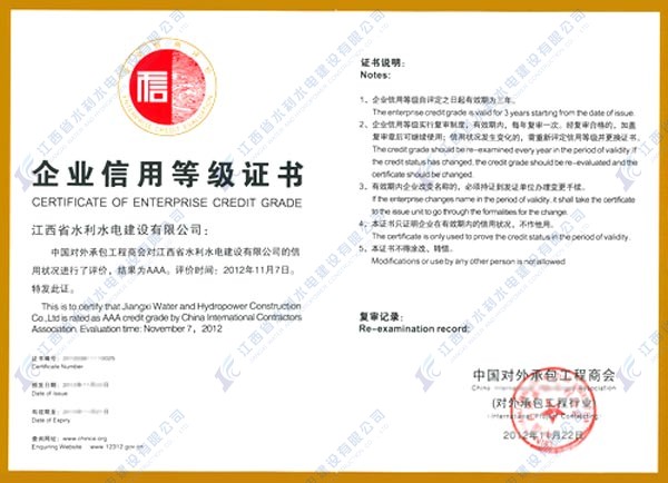 根據(jù)商務(wù)部、國資委聯(lián)合發(fā)布的《商會協(xié)會行業(yè)信用建設(shè)工作指導意見》的要求,中國對外承包工程商會于2012年9月啟動2012年度對外承包工程與勞務(wù)合作企業(yè)信用等級評價工作。經(jīng)對外承包工程與勞務(wù)合作企業(yè)信用等級評審委員會第八次工作會議審議,江西省水利水電建設(shè)有限公司被評定為2012年度對外承包工程企業(yè)信用評價AAA級信用企業(yè)。