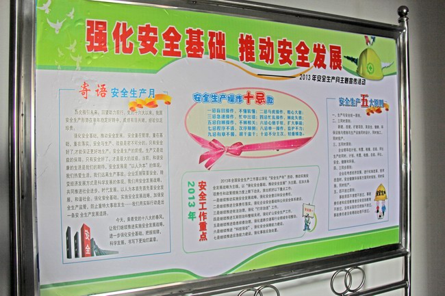 集團(tuán)資訊按照2013年“安全生產(chǎn)月”活動(dòng)實(shí)施方案要求,公司所屬各單位張貼、懸掛安全生產(chǎn)警示語,突出宣傳“強(qiáng)化安全基礎(chǔ),推動(dòng)安全發(fā)展”的活動(dòng)主題。