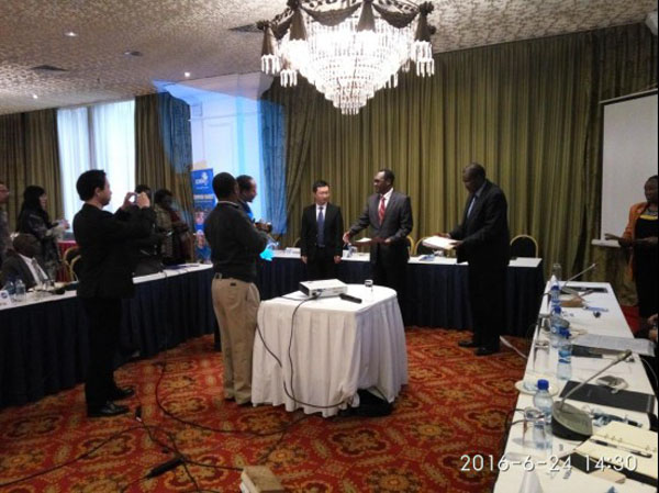 最后董國(guó)鋒處長(zhǎng)及肯尼亞商務(wù)部首席秘書(shū)Dr Chris Kiptoo共同為各國(guó)代表團(tuán)成員頒發(fā)此次培訓(xùn)的結(jié)業(yè)證書(shū)。本次活動(dòng)圓滿落幕。當(dāng)晚,公司董事、副總經(jīng)理、海外公司總經(jīng)理黃鄭民及肯尼亞公司副總經(jīng)理彭紅軍、經(jīng)營(yíng)部副經(jīng)理丁晨陽(yáng)一同出席了國(guó)際小水電中心的晚宴。