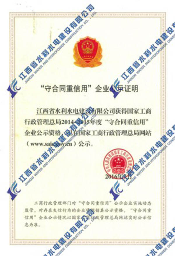 2016年我公司首次榮獲國家工商行政管理總局2014-2015年度“守合同重信用”企業(yè)公示資格?!笆睾贤匦庞谩惫净顒樱枪ど滩块T依托合同行政監(jiān)管職能組織開展的旨在推進(jìn)企業(yè)信用建設(shè)的“守重”企業(yè)公示活動,是長期以來我國社會信用體系建設(shè)的重要組成部分。