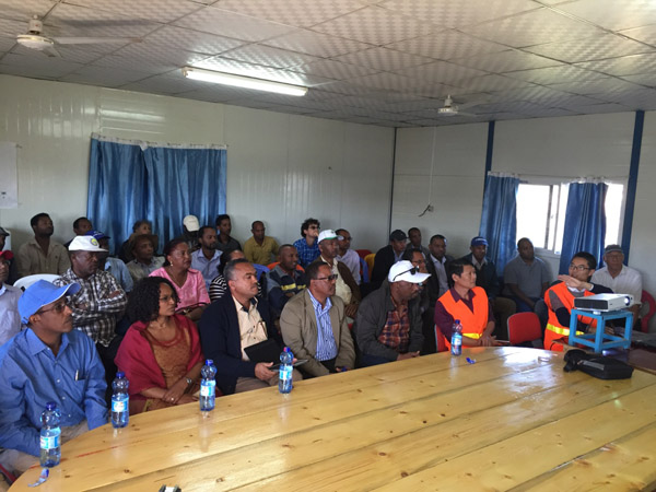 部長(zhǎng)一行于上午10時(shí)許抵達(dá)后,在我項(xiàng)目部主營(yíng)地召開了現(xiàn)場(chǎng)會(huì)議,埃塞公司副總經(jīng)理兼項(xiàng)目經(jīng)理黃生寶詳細(xì)的介紹了項(xiàng)目的進(jìn)展情況及六大施工管理區(qū)的實(shí)施情況。并表示,盡管面臨著工期縮短、征地困難等諸多阻礙,我司一定會(huì)團(tuán)結(jié)各方、迎難而上,完成施工任務(wù)為埃塞水利發(fā)展貢獻(xiàn)力量。