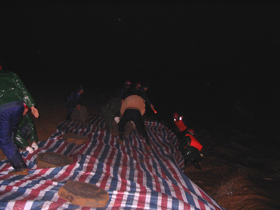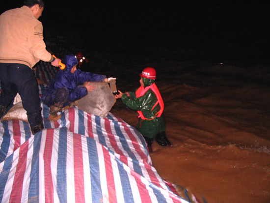 根據(jù)以往的施工經(jīng)驗(yàn),我們很快啟動(dòng)了搶險(xiǎn)應(yīng)急預(yù)案。但由于環(huán)境惡劣,考驗(yàn)我們的時(shí)候到了,要發(fā)揚(yáng)我們江西水建人“特別能吃苦、特別能戰(zhàn)斗、特別能忍耐、特別能協(xié)作精神”的時(shí)候到了,我們與洪水搶時(shí)間、爭(zhēng)進(jìn)度,全體干群在漆黑的大堤上是一片穿梭奔跑的身影,大家齊心協(xié)力,手提肩扛,把一百多斤一塊的混凝土預(yù)制塊,一塊塊運(yùn)到堤腳,此時(shí)項(xiàng)目部總工曾俊平不顧江水的寒冷,帶領(lǐng)其它幾名員工,奮身躍入水中,在水下鋪設(shè)彩條布,而此時(shí)水下溫度只有10℃左右,渾濁江水一浪高過一浪拍打在他們的身上。大家顧不上寒冷,顧不上疲勞,顧不上饑餓,衣服濕了又干,干了又濕,分不清是哪次被汗水還是雨水弄濕的,在微弱的手電光照亮下鋪設(shè)了一條又一條彩布條,碼起了一道又一道沙包小堤。經(jīng)過大家的緊張奮戰(zhàn),終于幾處險(xiǎn)情得到了控制,等到我們?cè)诿β抵谢剡^神來時(shí),已經(jīng)是次日的凌晨三點(diǎn)多鐘,盡管大家拖著一副疲憊不堪的泥身子,但大家臉上裝滿了滿意和勝利的微笑,王總此時(shí)飽含真情地對(duì)大家說了一聲:“大家真的辛苦了,謝謝大家!”走在回家的路上,我正好與項(xiàng)目總工曾俊平走在一起,我看到他渾身濕漉漉的,我關(guān)心的問他在水中冷嗎?他笑笑說道:“這是關(guān)鍵時(shí)刻,再冷也要下”。他旁邊的同事告訴我,他是從下午三點(diǎn)鐘就一直在水里做事直到剛才,整整在水中浸泡了十二個(gè)小時(shí)。我們參加搶險(xiǎn)的同志被曾俊平這種不怕困難、不畏艱險(xiǎn)、不顧個(gè)人安危、敢于吃苦的精神深深感動(dòng)著,真是我們學(xué)習(xí)的好榜樣!