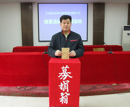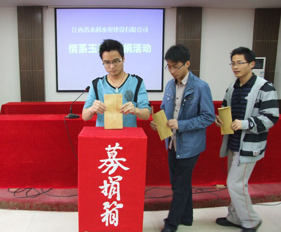 2010年4月14日,青海省玉樹(shù)縣發(fā)生兩次地震,最高震級(jí)7.1級(jí),造成了當(dāng)?shù)鼐薮蟮娜松韨龊拓?cái)產(chǎn)損失,“玉樹(shù)地震”牽動(dòng)著億萬(wàn)人民的心,也牽動(dòng)著我司所有員工的心!公司在全司范圍內(nèi)積極開(kāi)展“情系玉樹(shù)募捐活動(dòng)”,4月26日,我公司南昌市機(jī)關(guān)總部首先開(kāi)展了“情系玉樹(shù)募捐活動(dòng)”,公司中層以上管理人員和員工踴躍參與募捐活動(dòng),紛紛獻(xiàn)上自己的一份愛(ài)心,體現(xiàn)出江西水總?cè)说纳鐣?huì)責(zé)任感!同時(shí),各分公司、國(guó)內(nèi)外施工項(xiàng)目部也在開(kāi)展此項(xiàng)活動(dòng),預(yù)計(jì)此項(xiàng)活動(dòng)將募得資金3萬(wàn)余元。