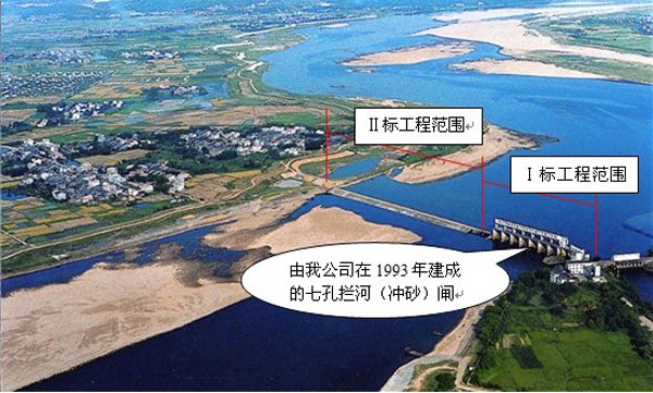 江西省撫河焦石壩水庫是江西省贛撫平原灌區(qū)水利樞紐的主體(渠首)工程,該工程位于撫河下游的進(jìn)賢縣李渡鎮(zhèn)焦石村,工程始建于1958年,1959年建成投入運行。1966年對攔河閘壩建筑物進(jìn)行了全面加固處理,為了解決焦石壩上游泥沙淤積嚴(yán)重問題,于1993年將左側(cè)97.3m砼溢流壩改建為七孔攔河(沖砂)閘(本公司承建)。