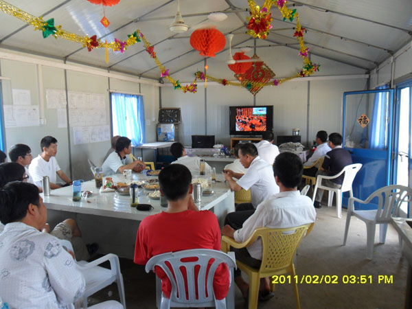 “金虎辭舊歲,玉兔迎新春”。2月2日,在祖國舉國歡慶,萬家團聚的時候,項目經(jīng)理候?qū)W剛首先致辭。隨后,公司副總經(jīng)理黃鄭民轉(zhuǎn)達了公司董事長、總經(jīng)理王元旦同志向戰(zhàn)斗在國外的同志們的親切問候和良好祝愿,并總結(jié)了一年來項目部取得的可喜成績,對2011年寄于主體工程基本完工的希望,相信灌溉項目一定會是安全的、高效的。