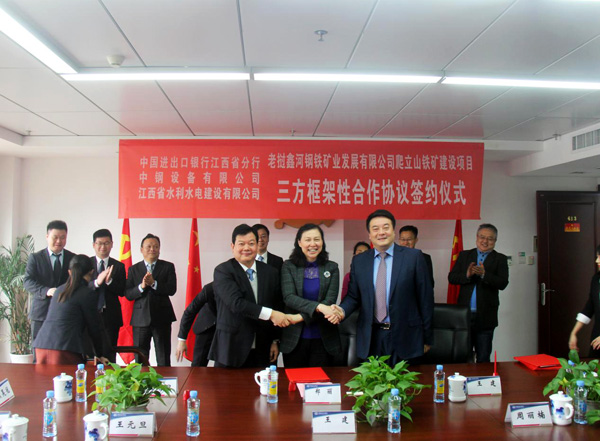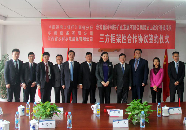 12月29日上午,在江西省商務(wù)廳副廳長方向軍、外經(jīng)處處長王健的見證下,公司與中國進(jìn)出口銀行江西省分行和中鋼設(shè)備有限公司就老撾鑫河鋼鐵礦業(yè)發(fā)展有限公司爬立山鐵礦建設(shè)項(xiàng)目正式簽訂三方框架性合作協(xié)議。中國進(jìn)出口銀行江西省分行行長鄭麗、中鋼設(shè)備有限公司總經(jīng)理王建、公司董事長王元旦、海外公司總經(jīng)理黃鄭民等出席簽約儀式。
