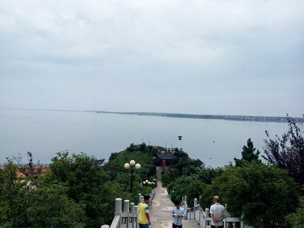 除了饒娥像,其對(duì)面的斗笠山也是美景所在之處。入山前,首先看到的是一條由青石板鋪成的臺(tái)階,臺(tái)階蜿蜒陡峭,兩側(cè)是漢白玉雕欄,欄上雕龍繪鳳,栩栩如生。抬頭仰望,只見臺(tái)階盡頭是一座高聳的石碑,燙金而書“天下第一碑”幾個(gè)大字。一路走走停停到了石碑前,眼前豁然開朗,放眼瞭望,到處一片茫茫水面,碧波蕩漾,翻起碎玉點(diǎn)點(diǎn)。窮極目力,水天一線之間,一座三角錐狀燈塔若隱若現(xiàn),“浩渺鄱湖水接天,波翻浪涌競(jìng)爭(zhēng)先;連江通海胸懷廣,滋養(yǎng)生靈歲復(fù)年?!庇嗬系摹钝蛾栱灐氛\不欺我。臺(tái)階中央又有一小平臺(tái),連接至一片紅墻黃瓦的走廊,廊前紅墻上鑲嵌著墨色的石板,上面刻著一些當(dāng)代大家對(duì)鄱陽湖的見聞和贊譽(yù),筆走龍蛇,字體蒼勁,令人賞心悅目之時(shí)不免肅然起敬。走下斗笠山,已經(jīng)接近傍晚,金日西斜,站在饒娥像后眺望,湖面一片金鱗銀濤,美如油畫。