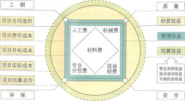 “方圓圖”是具有操作性的工具。其一,“方圓圖” 完整詮釋了建筑項(xiàng)目管理行為間的關(guān)系?!敖禹?xiàng)目”確定了合同造價(jià),對(duì)應(yīng)方圓圖的實(shí)線圓;“做項(xiàng)目”的第一步是下達(dá)項(xiàng)目目標(biāo)責(zé)任書(shū),確定項(xiàng)目責(zé)任成本,對(duì)應(yīng)方圓圖的責(zé)任成本方形,第二步分子公司在責(zé)任書(shū)的基礎(chǔ)上進(jìn)行項(xiàng)目實(shí)施策劃,產(chǎn)生項(xiàng)目的目標(biāo)成本,對(duì)應(yīng)方圓圖的目標(biāo)成本方形,第三步就是項(xiàng)目實(shí)施過(guò)程的管控,最終確定實(shí)際成本,對(duì)應(yīng)方圓圖的實(shí)際成本方形。“算賬收錢(qián)”就是完成項(xiàng)目過(guò)程中的結(jié)算變更與最后的決算收款,從而確定結(jié)算造價(jià),對(duì)應(yīng)方圓圖的結(jié)夢(mèng)造價(jià)虛線圓。項(xiàng)目實(shí)施過(guò)程中進(jìn)度、質(zhì)量、安全、環(huán)保及周邊相關(guān) 方的管理對(duì)應(yīng)成本方形的四個(gè)支撐頂點(diǎn),構(gòu)成成本的五項(xiàng)費(fèi)用“材料、人工、機(jī)械、現(xiàn)場(chǎng)經(jīng)費(fèi)、專業(yè)分包”對(duì)應(yīng)成本方形的內(nèi)部區(qū)域。