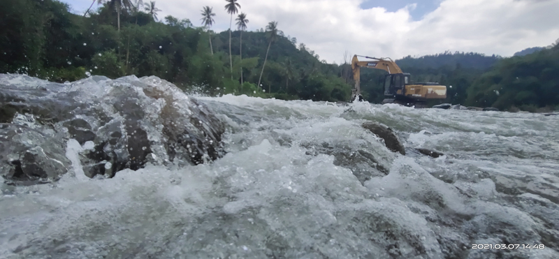 文字說明;該照片是在伯恩河中用手機(jī)拍攝,是印尼疫情復(fù)工后開辟新施工道路時(shí)的場景。在奔騰的洪流中激流拍石,浪花飛濺,挖機(jī)迎難而上,象征著公司堅(jiān)韌不屈的品格、水建人大無畏的工作熱情。對(duì)岸的滿山綠樹在藍(lán)天白云下,勾勒出一幅壯麗的畫面,預(yù)示著伯恩電站的美好未來,高高的椰子樹,象征著集團(tuán)公司輝煌的明天!